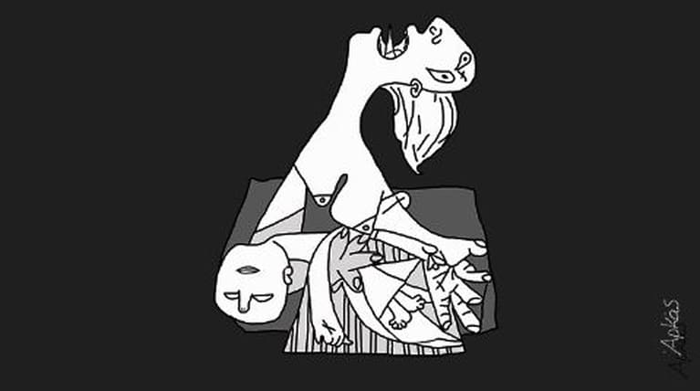 Η λεζάντα του σκίτσου γράφει: “Από τη Σούτσσταφελ στη Χαμάς και από τη Γκέρνικα στη Γάζα. Η κτηνωδία και ο σπαραγμός δεν έχουν ούτε εποχή ούτε εθνικότητα”.