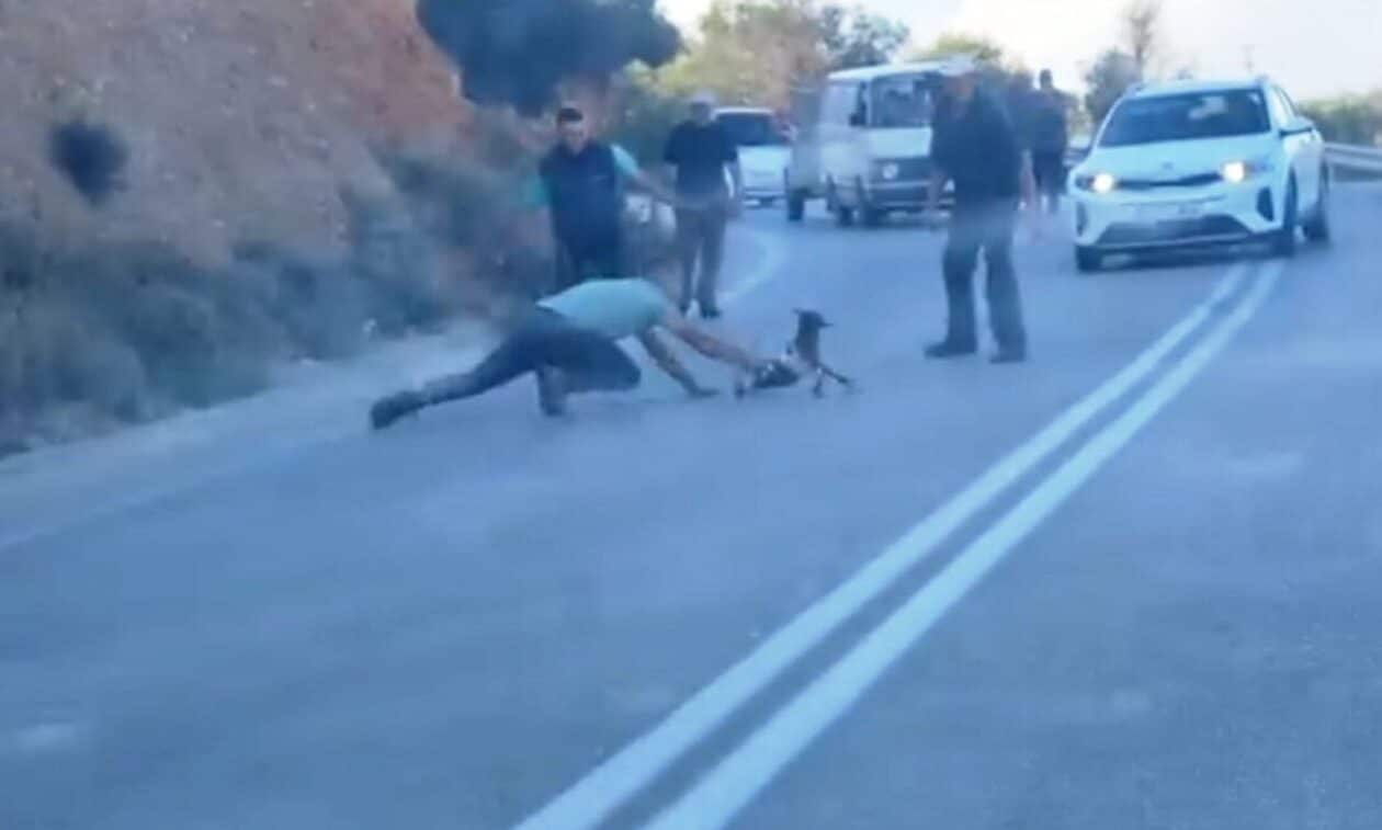 Κρήτη: Ο άνδρας έπιασε με «βουτιά» το αρνάκι που κινδύνεψε να παρασυρθεί από τα διερχόμενα οχήματα