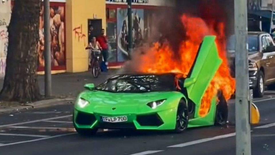 Μια Lamborghini Aventador φλέγεται στη μέση του δρόμου στο Βερολίνο της Γερμανίας και οι διερχόμενοι βλέπουν το αποκρουστικό θέαμα.