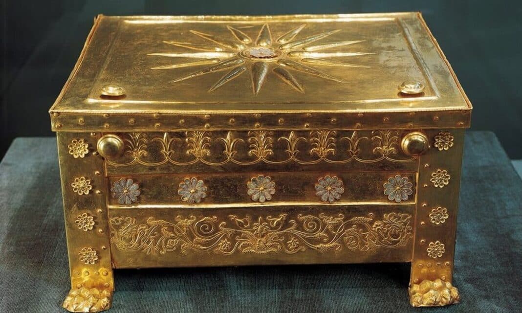 Οπωσδήποτε, συλλογιζόμουν, μέσα στη σαρκοφάγο πρέπει να κρύβεται μια ωραία έκπληξη. Η μόνη δυσκολία που συναντήσαμε ήταν πως την ώρα που ανασηκώναμε το κάλυμμα, είδαμε καθαρά πια το περιεχόμενο και έπρεπε να μπορέσουμε να κρατήσουμε την ψυχραιμία μας και να συνεχίσουμε τη δουλειά μας, μόλο που τα μάτια μας είχαν θαμπωθεί απ’ αυτό που βλέπαμε και η καρδιά μας πήγαινε να σπάσει από συγκίνηση. Μέσα στη σαρκοφάγο υπήρχε μια ολόχρυση λάρνακα. Επάνω στο κάλυμμά της ένα επιβλητικό ανάγλυφο αστέρι με δεκάξι ακτίνες, και στο κέντρο του ένας ρόδακας.