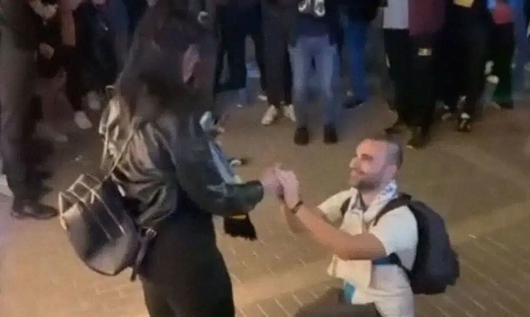 Οπαδοί και των δύο ομάδων είχαν πάρει θέση, ο Γάλλος έσκυψε έβγαλε από την τσέπη του το μονόπετρο, το πρόσφερε στην Μαρία και εκείνη εν μέσω αποθέωσης είπε το μεγάλο «ναι».