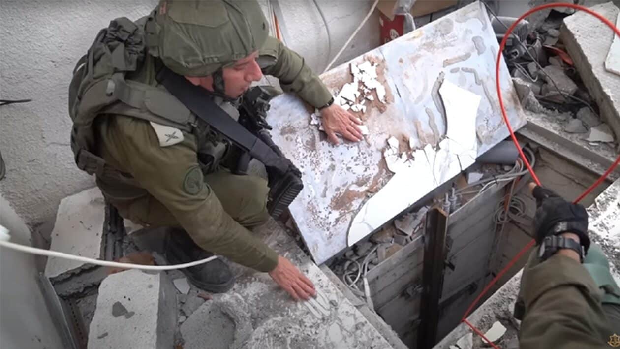 Όπως φαίνεται στο βίντεο ο στρατιωτικός περπατά μέσα από μια από τις υπόγειες σήραγγες της Χαμάς, μόνο και μόνο για να βγει στο νοσοκομείο Ραντίσι της Γάζας στην άλλη πλευρά.