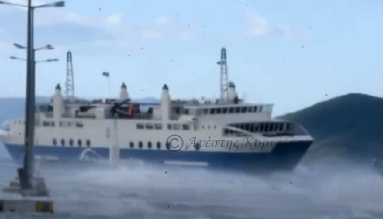 Εικόνες που σοκάρουν από την αγωνιώδη προσπάθεια του πλοίου Αχαιός να δέσει στο λιμάνι της Αίγινας, το οποίο βάλλεται από θυελλώδεις ανέμους.