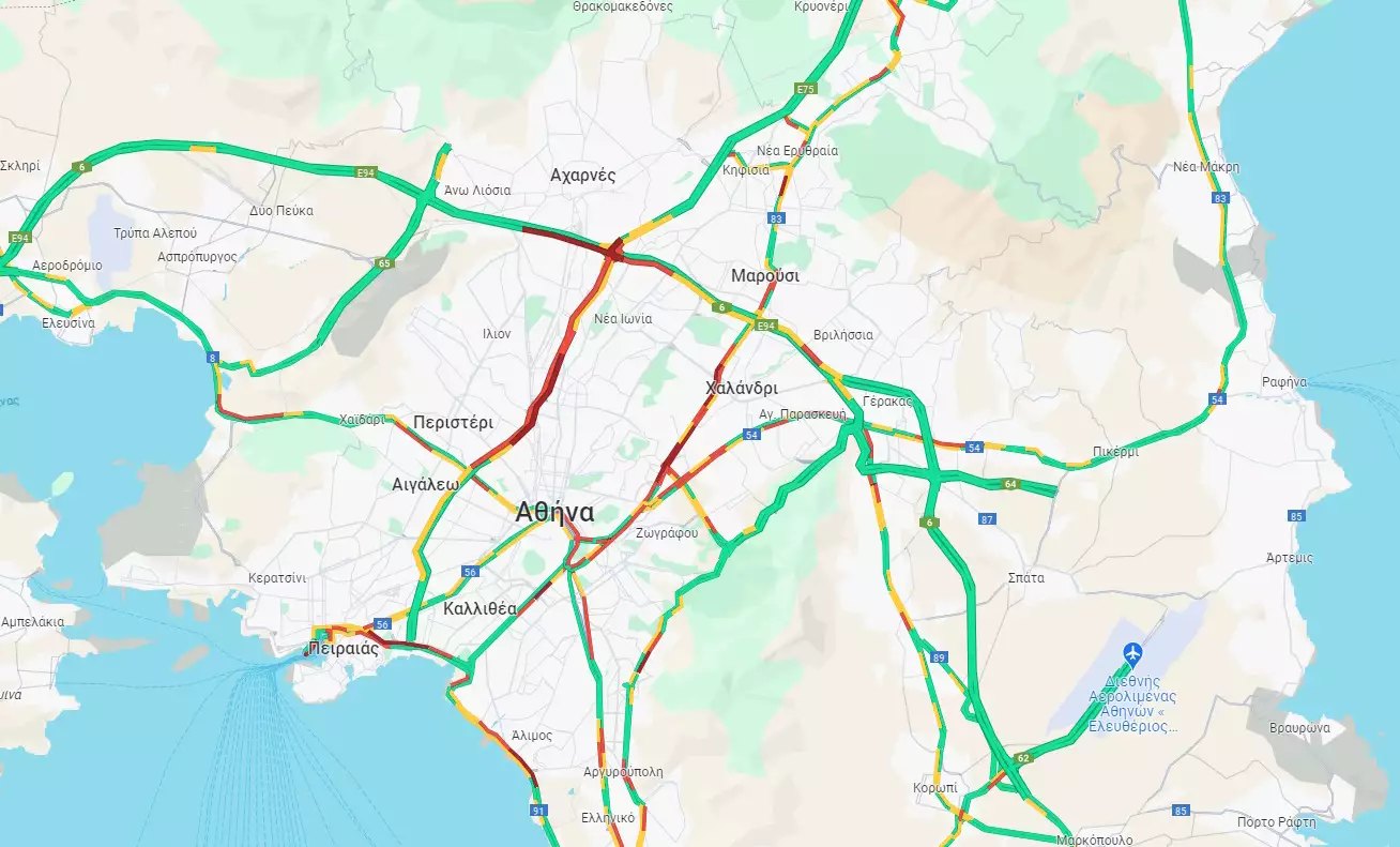 Καθυστερήσεις της τάξεως των 10-15 λεπτών καταγράφονται στο ρεύμα προς Αεροδρόμιο από τον κόμβο Μεταμόρφωσης μέχρι τον κόμβο Κηφισίας.
