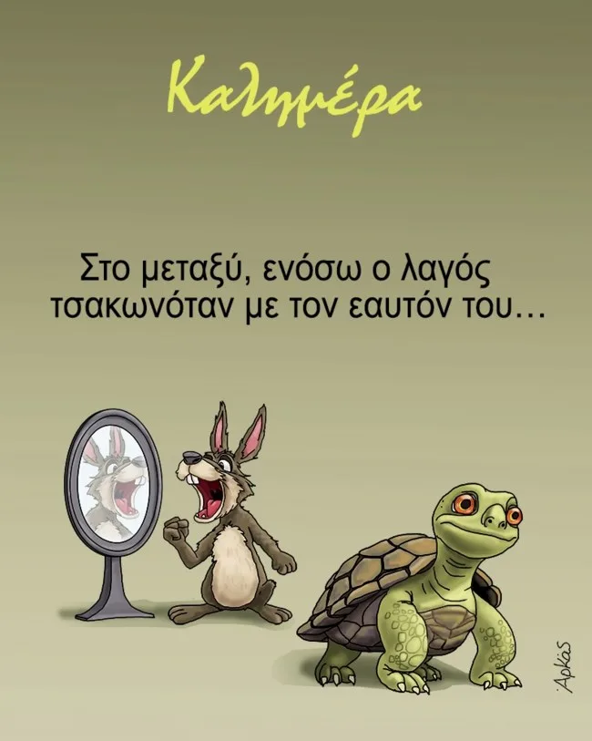Σήμερα με το νέο του καυστικό σκίτσο βλέπουμε τον λαγό που τσακώνεται με τον εαυτό του, και τη χελώνα που προχωρά μπροστά. Ο καθένας το ερμηνεύει όπως θέλει αλλά μάλλον αποτελεί αιχμή για τον ΣΥΡΙΖΑ και για τα μικρότερα κόμματα τα οποία αποκτούν δύναμη από την «αναταραχή» που επικρατεί στους κόλπους του. Το «μαγικό» του πράγματος με τα σκίτσα του είναι όπως ήδη αναφέραμε η ελευθερία της ερμηνείας.