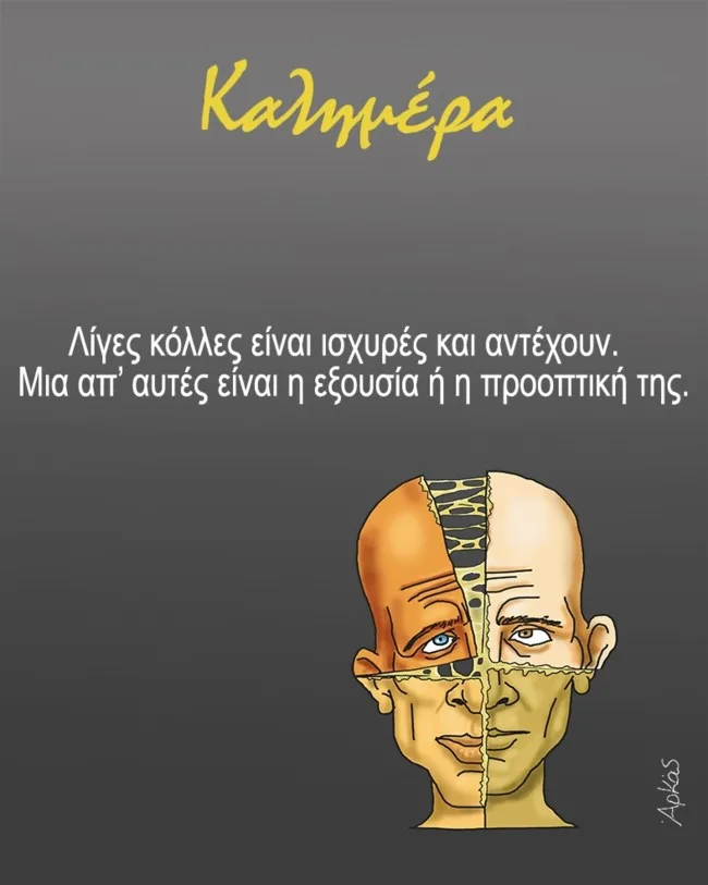 Στη λεζάντα του σκίτσου αναφέρει: «Λίγες κόλλες είναι ισχυρές και αντέχουν. Μία από αυτές είναι η εξουσία ή η προοπτική της».