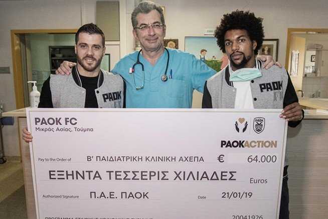 Τη Δευτέρα (21.01) ο Αντρέ Βιεϊρίνια με τον Ντιέγκο Μπίσεσβαρ εκπροσώπησαν τον ΠΑΟΚ στην παράδοση της ετήσιας επιταγής ύψους 64.000 ευρώ για την ενίσχυση του ΑΧΕΠΑ. Στα έξι χρόνια που ο κ. Σαββίδηςστηρίζει την Παιδοογκολογική Πτέρυγα, έχει συμβάλει στην αγορά μηχανημάτων, ενώ έχει καλύψει τους μισθούς για την εργασία 14 ιατρών που εργάζονταν κι εργάζονται στην Πτέρυγα προκειμένου να φροντίζουν τα περισσότερα 200 παιδιά που έχουν νοσηλευτεί στο ΑΧΕΠΑ.