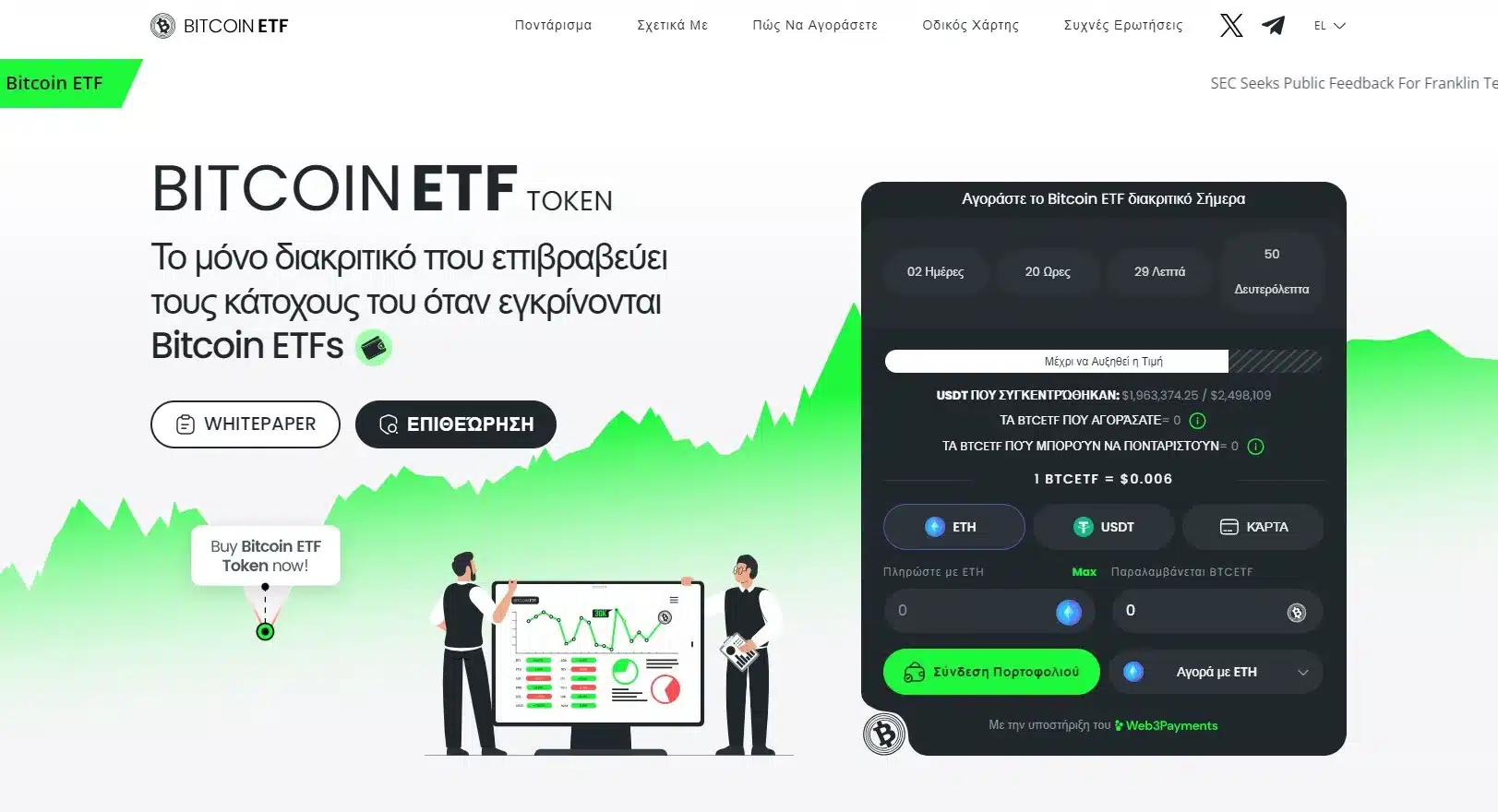 Ένα από τα κρυπτονομίσματα που έχουν κερδίσει το ενδιαφέρον της αγοράς crypto, είναι το Bitcoin ETF. Πρόκειται για ένα καινοτόμο εγχείρημα το οποίο αξιοποιεί τα επερχόμενα γεγονότα που σχετίζονται με το Bitcoin, για να προσφέρει εξαιρετικές ανταμοιβές στους επενδυτές του.