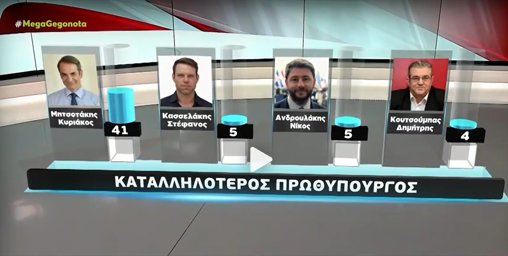 Καταλληλότερος πρωθυπουργός με διαφορά ο Κυριάκος Μητσοτάκης ο οποίος συγκεντρώνει ποσοστό 41%. Δεύτερος αναδεικνύεται ο «κανένας» με 31% και στην τρίτη θέση είναι οι Κασσελάκης και Ανδρουλάκης με ποσοστό μόλις 5%.