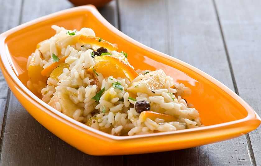 Στην κατσαρόλα ρίχνουμε το λάδι και τσιγαρίζουμε λιγάκι το κρεμμύδι. Όταν αρχίσει να γίνεται διαφανές, ρίχνουμε το ρύζι, την κολοκύθα και το κυδώνι, μαζί με το σκόρδο και τα ανακατεύουμε 2 – 3 λεπτά. Αλατοπιπερώνουμε και σβήνουμε με το κρασί. Ανακατεύουμε και ρίχνουμε την ψιλοκομμένη φλούδα και τις σταφίδες.