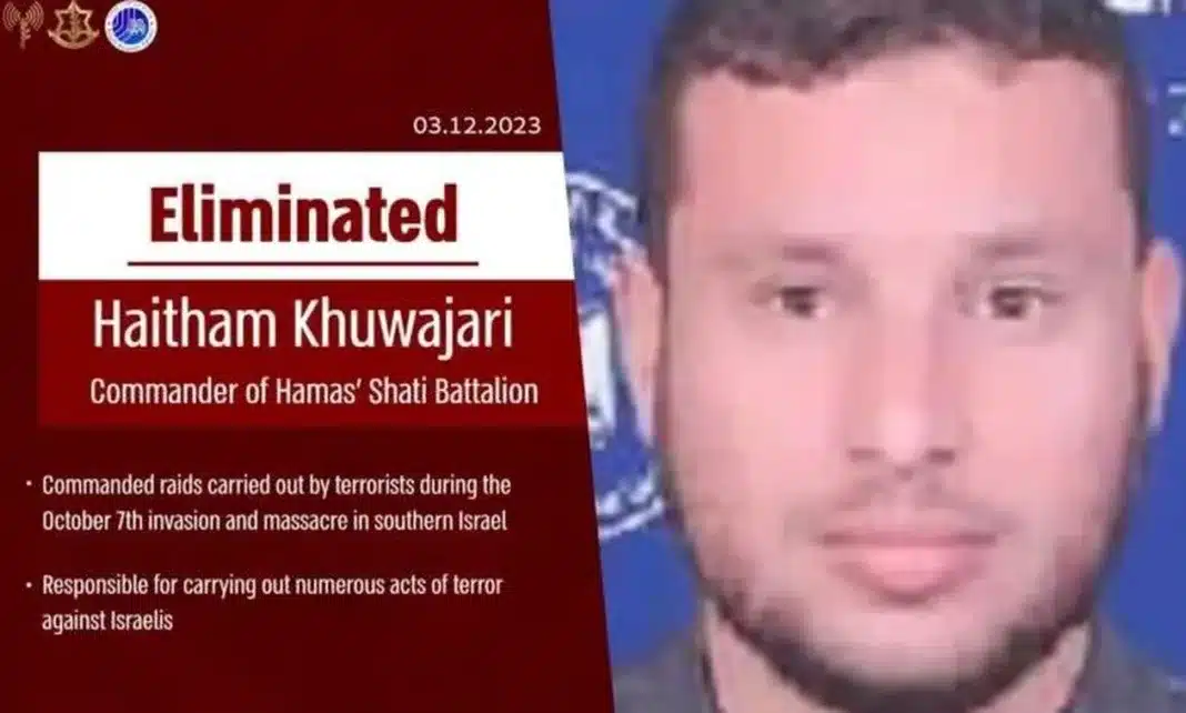 Ο ισραηλινός στρατός ανακοίνωσε ότι σε αεροπορική επιδρομή στη Γάζα εξολόθρευσε τον Κhaitam Khuwajari, διοικητή του τάγματος «Σάτι» της Χαμάς, o oποίος είχε ηγηθεί ενός τάγματος που συμμετείχε στις επιθέσεις της Χαμάς στο Ισραήλ στις 7 Οκτωβρίου