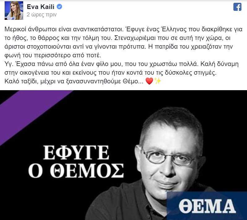 Με ένα συγκινητικό μήνυμα στην προσωπική της σελίδα στο Facebook, αποχαιρέτισε η ευρωβουλευτής της «Ελιάς», Εύα Καϊλή, τον Θέμο Αναστασιάδη.