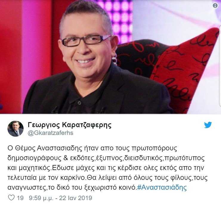Θέμος Αναστασιάδης | Ειδήσεις: Συλλυπητήρια μηνύματα στην οικογένεια του δημοσιογράφου και εκδότη του «Πρώτου Θέματος», Θέμου Αναστασιάδη, ο οποίος πέθανε την Τρίτη (22/01/2019) σε ηλικία 61 ετών έπειτα από πολύμηνη μάχη με τον καρκίνο, στέλνει ο πολιτικός κόσμος