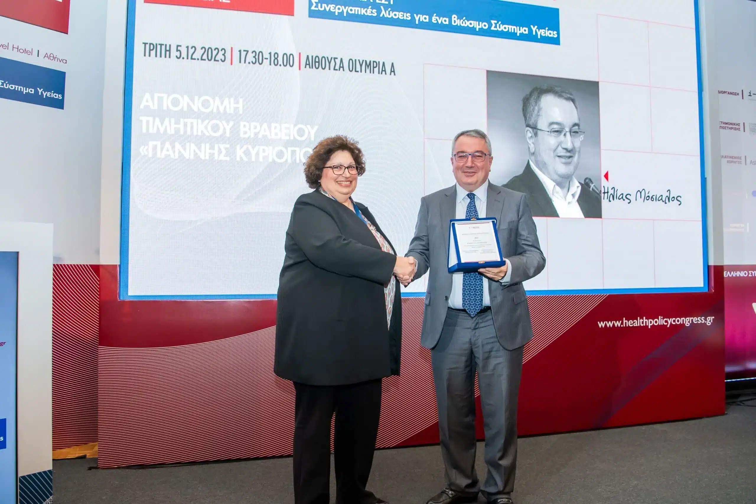 Το πρώτο βραβείο «Γιάννης Κυριόπουλος» απονεμήθηκε το απόγευμα της Τρίτης στον Καθηγητή Ηλία Μόσιαλο, Καθηγητή Πολιτικής Υγείας και κάτοχο της έδρας Brian-Abel Smith του London School of Economics. Το βραβείο θεσμοθετήθηκε πέρυσι από το Ινστιτούτο Οικονομικών της Υγείας, πρόεδρος του οποίου υπήρξε ο αείμνηστος Γιάννης Κυριόπουλος.