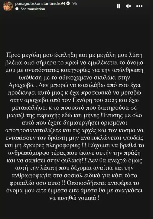 Ο Παναγιώτης Κωνσταντινίδης έγραψε σε ανάρτησή του: «Προς μεγάλη μου έκπληξη και με μεγάλη μου λύπη βλέπω από σήμερα το πρωί να εμπλέκεται το όνομά μου με ανυπόστατες κατηγορίες για την απάνθρωπη υπόθεση με το αδικοχαμένο σκυλάκι στην Αράχωβα.