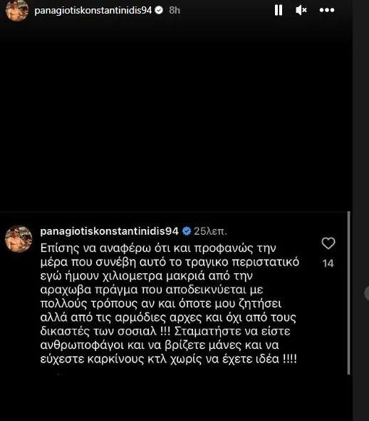 Οποιοσδήποτε αναφέρει το όνομά μου είτε έμμεσα, είτε άμεσα θα με αναγκάσει να κινηθώ νομικά. Επίσης να αναφέρω ότι προφανώς τη μέρα που συνέβη αυτό το τραγικό γεγονός, εγώ ήμουν χιλιόμετρα μακριά από την Αράχωβα, πράγμα που αποδεικνύεται από πολλούς τρόπους αν και όποτε μου ζητηθεί, αλλά από τις αρμόδιες αρχές και όχι από τους δικαστές των σόσιαλ.