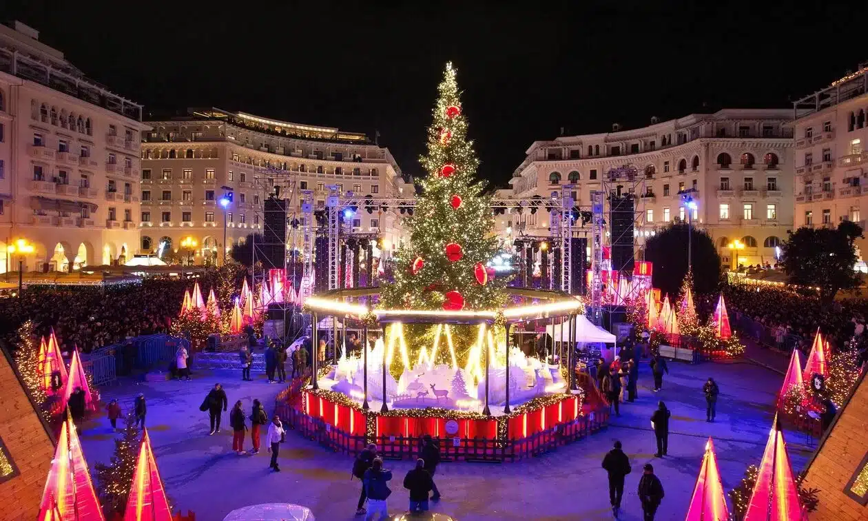 Η Θεσσαλονίκη φόρεσε τα γιορτινά της, καθώς το απόγευμα της Πέμπτης φωταγωγήθηκε το εντυπωσιακό χριστουγεννιάτικο δέντρο, στην πλατεία Αριστοτέλους.