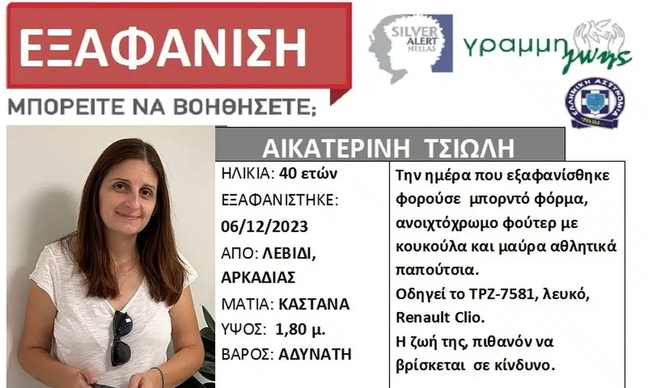 Κορυφώνεται η αγωνία στην Αρκαδία για την εξαφάνιση της 40χρονης γυναίκας. Τα ίχνη της χάθηκαν την Τετάρτη 6 Δεκεμβρίου, όταν σύμφωνα με το οικογενειακό της περιβάλλον, ξεκίνησε από το σπίτι της, στο Λεβίδι για να πάει στη δουλειά. Δεν έφτασε ποτέ εκεί. Λίγες ώρες αργότερα δηλώθηκε η εξαφάνισή της και ξεκίνησαν έρευνες για τον εντοπισμό της. Μέχρι στιγμής παραμένουν άκαρπες και οι άσχημες σκέψεις βρίσκονται διαρκώς στο μυαλό, στενών συγγενών της.