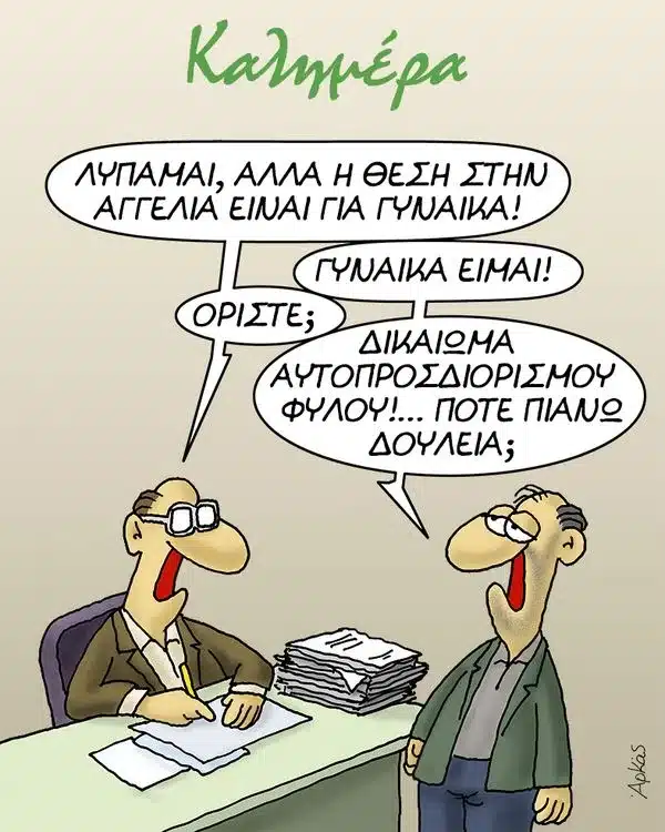 Αρκάς: Με το ζήτημα του αυτοπροσδιορισμού φύλου καταπιάνεται με το σημερινό νέο σκίτσο του ο διάσημος σκιτσογράφος.