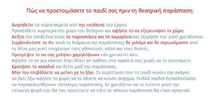 Το θέατρο είναι μία τέχνη σύνθετη και μοναδική που συνδυάζει την υποκριτική, τη λογοτεχνία και τη μουσική. Η κάθε θεατρική παράσταση είναι ξεχωριστή γιατί πέρα από το κείμενο βασίζεται στους συντελεστές της, έτσι ένα έργο μπορεί να γίνει από εξαιρετικό μέχρι και αδιάφορο. Φροντίστε εσείς μαζί με το παιδί σας να κάνετε την κατάλληλη επιλογή και καλή σας διασκέδαση.
