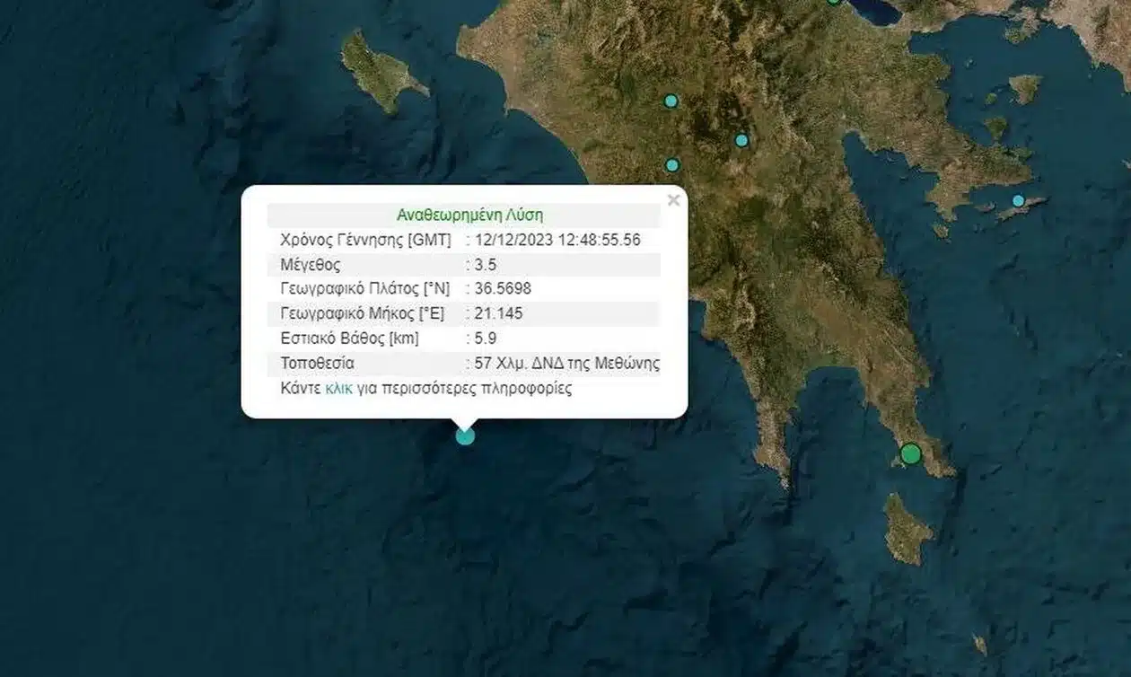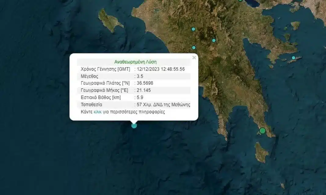 Σεισμική δόνηση μεγέθους 3,5 βαθμών της κλίμακας Ρίχτερ σημειώθηκε το μεσημέρι της Τρίτης (12/12) στη Μεθώνη.