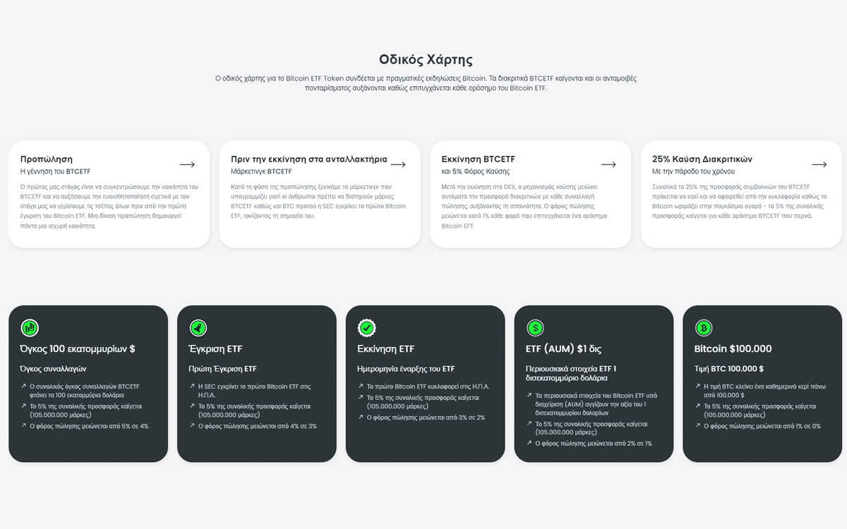 Το Bitcoin ETF Token είναι σχεδιασμένο ώστε να εκμεταλλευτεί την επικείμενη έγκριση ενός Spot Bitcoin ETF, γεγονός που θα φέρει επανάσταση στην αγορά crypto. Βασισμένο στο Blockchain του Ethereum, αυτό το φθηνό κρυπτονόμισμα για την ώρα, ενσωματώνει έναν μηχανισμό καύσης, ο οποίος ενεργοποιείται από διάφορα ορόσημα. Η έγκριση των ETF, η επίσημη κυκλοφορία του πρώτου ETF, ο συνολικό όγκος συναλλαγών και η τιμή του Bitcoin αποτελούν μερικά από τα ορόσημα αυτά.