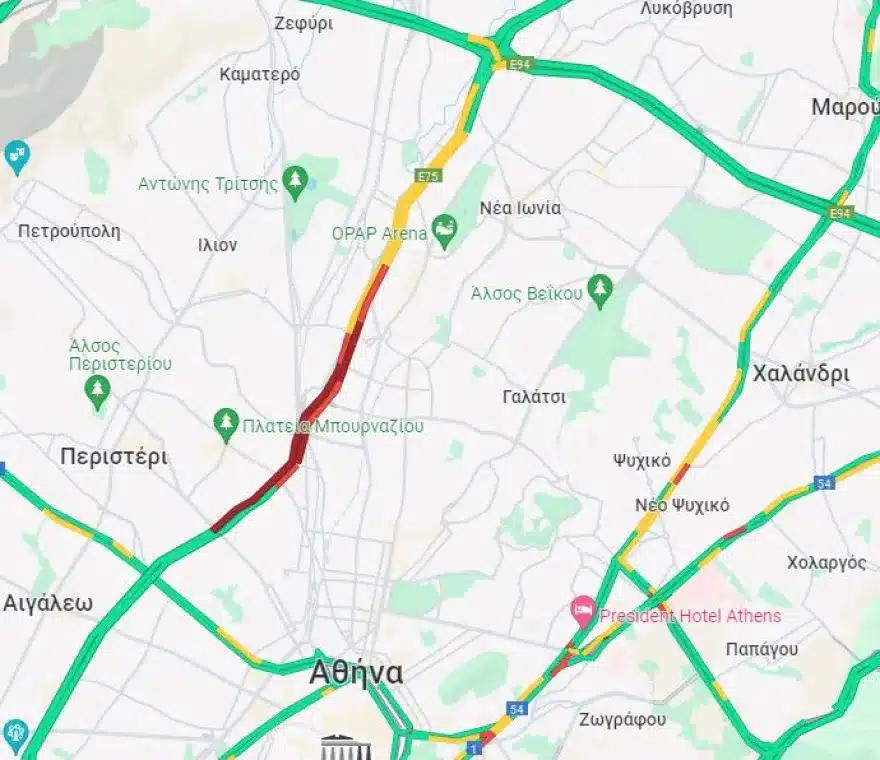 Αυξημένη κίνηση κατά τμήματα και στην κάθοδο της Κηφισίας, στο ρεύμα της Μεσογείων προς Αθήνα και στον Καρέα προς Κατεχάκη.