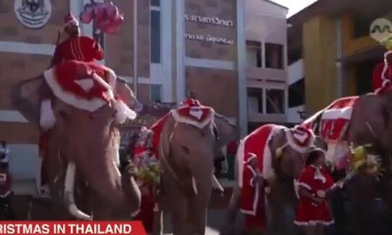 Ένα υπέροχο θέαμα είχαν την ευκαιρία να απολαύσουν οι μαθητές σε δημοτικό σχολείο στην Ταϊλάνδη, τους οποίους επισκέφθηκαν πέντε ελέφαντες ντυμένοι σαν τον Άγιο Βασίλη.
