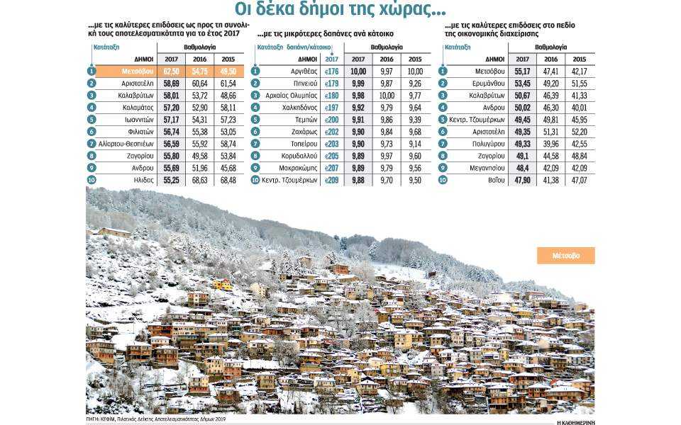Στη δεύτερη θέση βρέθηκε ο Δήμος Αριστοτέλη στη Χαλκιδική και στην τρίτη ο Δήμος Καλαβρύτων στην Αχαΐα. Ομως, δεν επιτρέπεται ενθουσιασμός. Η Ελλάδα έχει 325 δήμους. Με άριστα το 10, ο πρώτος δήμος –του Μετσόβου– βαθμολογείται απλώς με «καλώς», δηλαδή 6,25 μονάδες.
