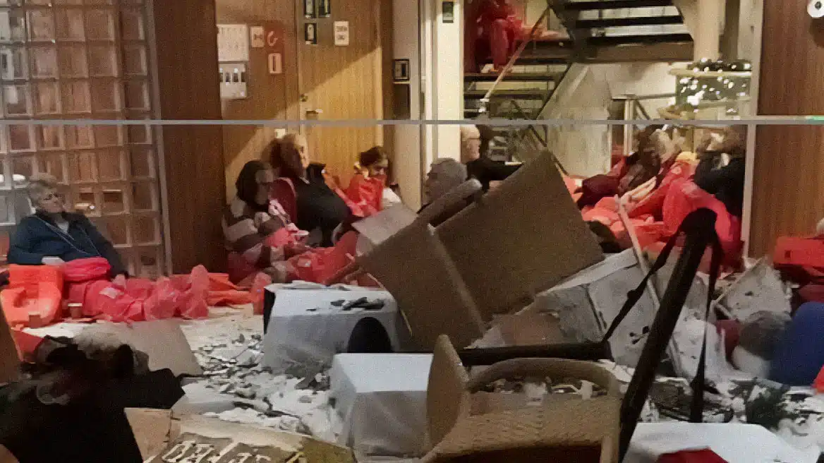 Οι επιβάτες του καθηλωμένου MS Maud εμφανίζονται σε βίντεο να φορούν σωσίβια και να κρατιούνται πάνω σε τραπέζια αφού το πλοίο χτυπήθηκε από κύματα ύψους 21 μέτρων και θυελλώδεις ανέμους που προκλήθηκαν από την καταιγίδα Pia την περασμένη εβδομάδα.