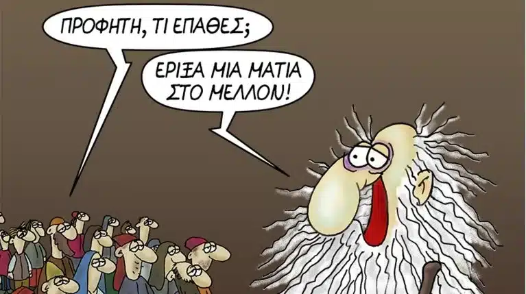 “Προφήτη τι έπαθες;” ρωτούν στο παρακάτω σκίτσο οι πιστοί. “Έριξα μια ματιά στο μέλλον” απαντά εκείνος, με τα μαλλιά και τα γένια του να έχουν σηκωθεί, όπως συνηθίζεται να απεικονίζεται ο τρόμος στα σκίτσα.
