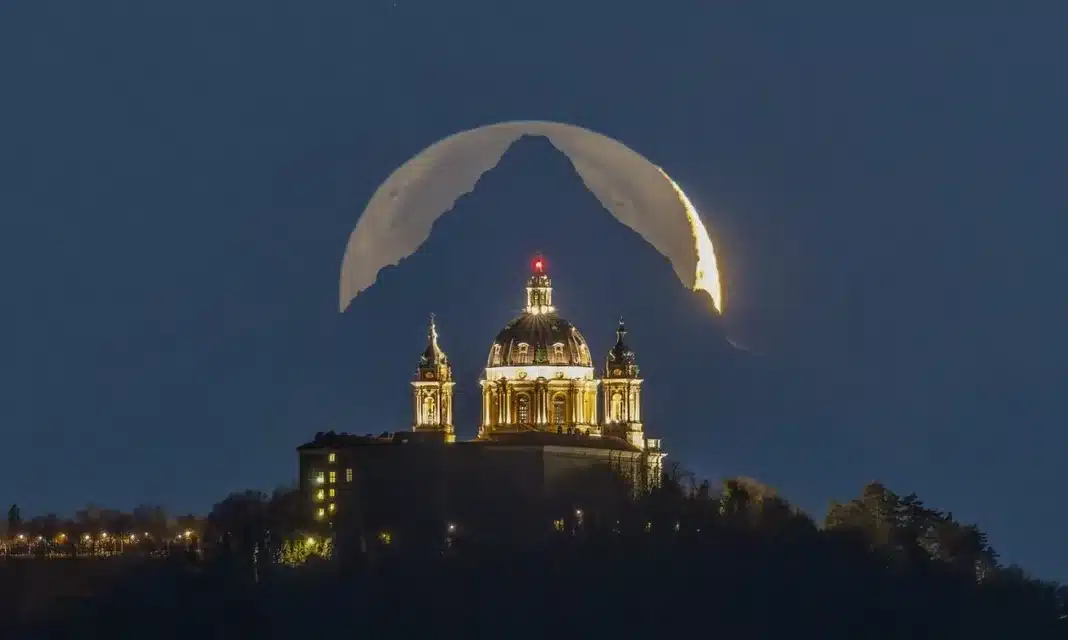 Ο Βαλέριο Μινάτο τράβηξε μία μαγευτική φωτογραφία του φεγγαριού τέλεια εναρμονισμένο με τον τρούλο της Βασιλικής του Superga, στο Τορίνο και την κορυφή του Monte Viso, του υψηλότερου βουνού στις Κοττιανές Άλπεις.