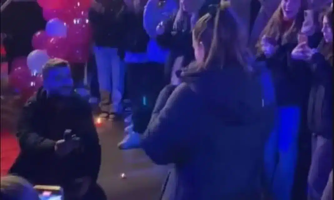 Ο νεαρός μπροστά σε πλήθος κόσμου και εν μέσω χειροκροτημάτων και επιδοκιμασιών, δίπλα στο έλατο με εκατοντάδες λαμπιόνια, αφού γονάτισε, άνοιξε το κουτάκι με το δαχτυλίδι και στη έκανε πρόταση γάμου στην αγαπημένη του.