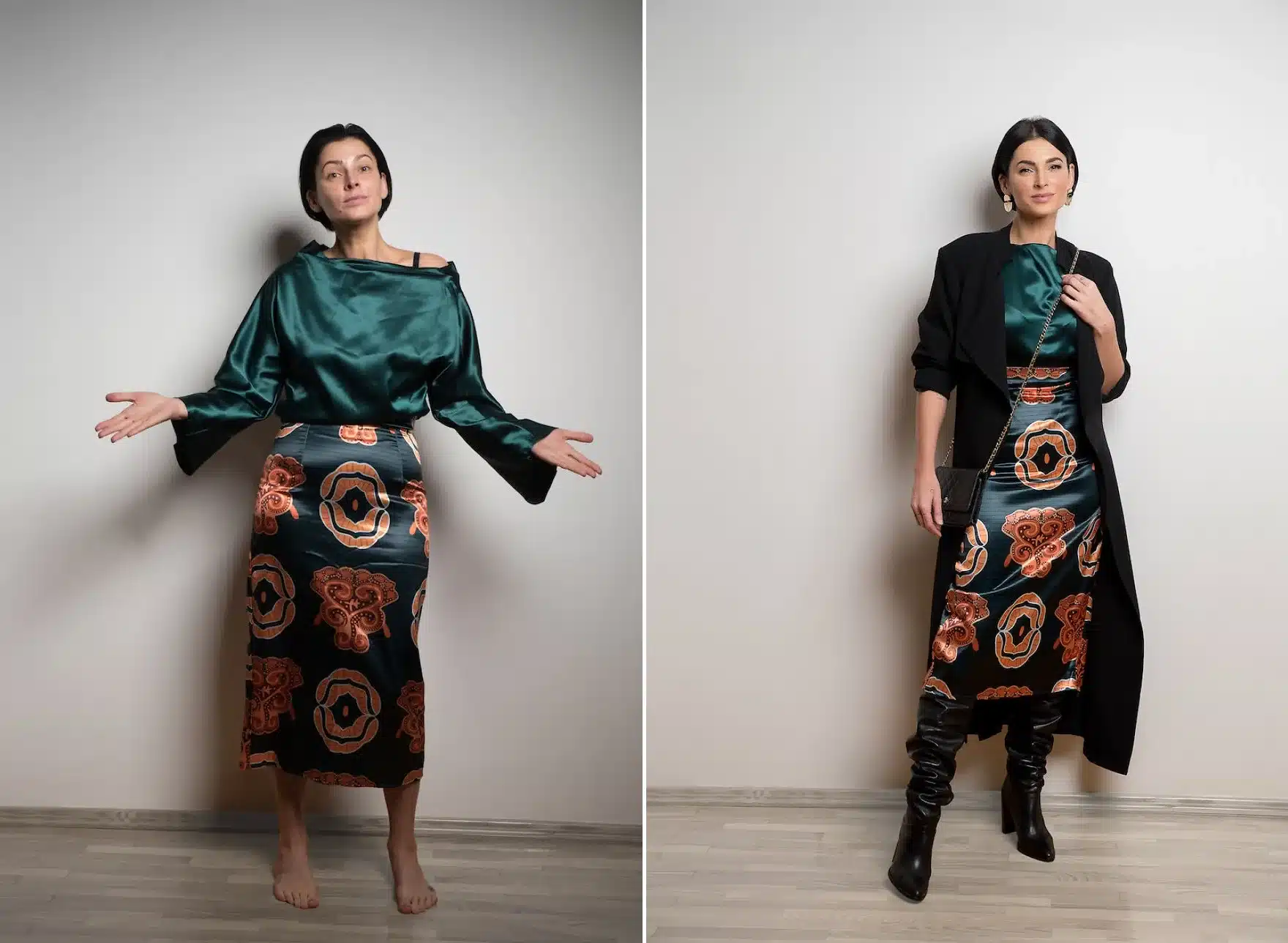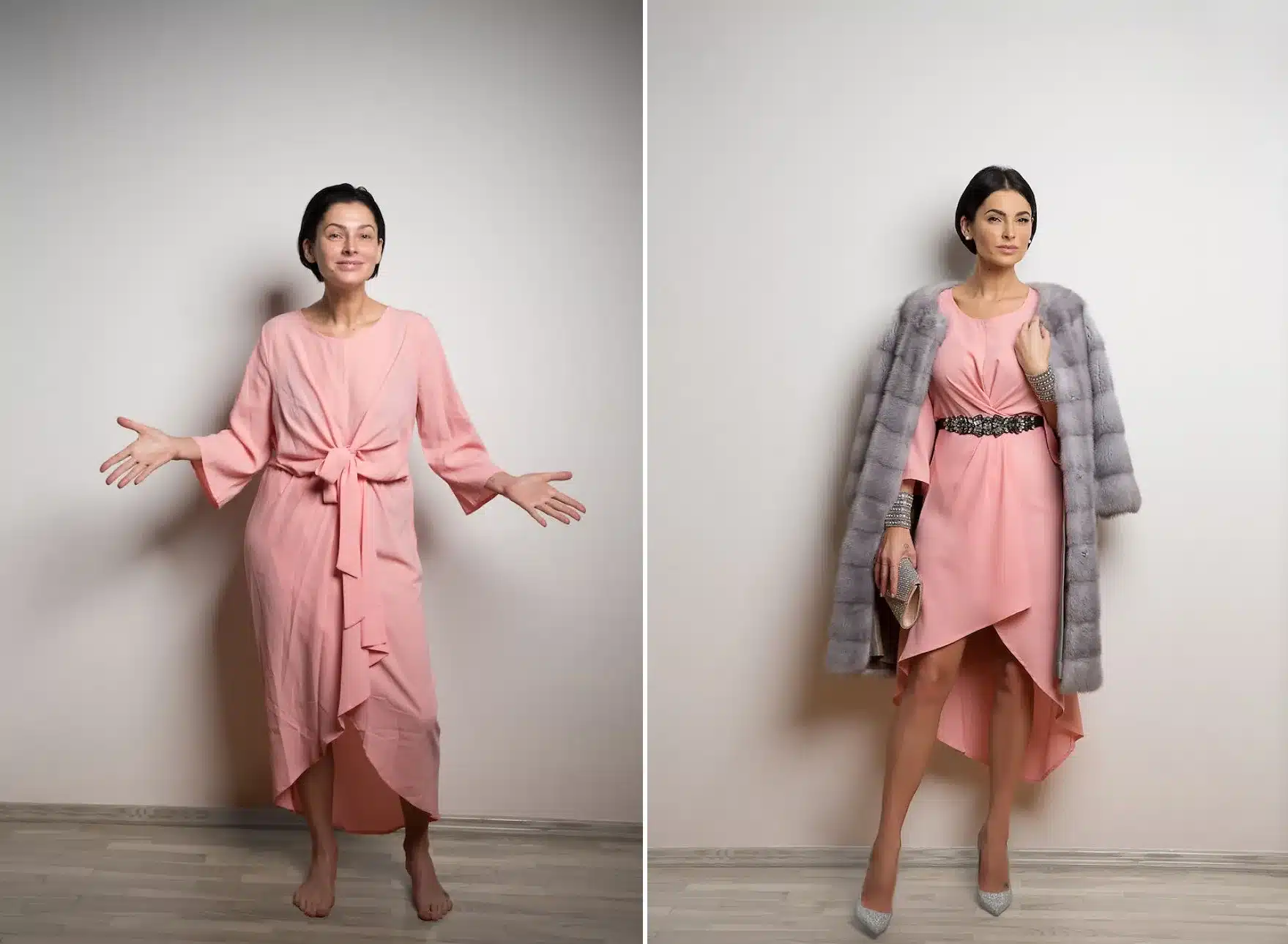 Το φόρεμα που έλαβε (αριστερά) και η μετατροπή του (δεξιά)
