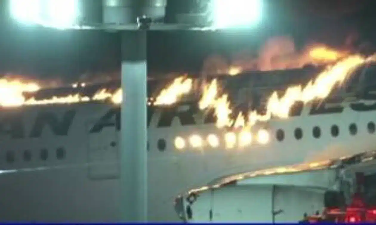 Όπως μεταδίδει το BBC, πλάνα που από το τηλεοπτικό δίκτυο NHK έδειξαν φλόγες να βγαίνουν από τα παράθυρα του αεροσκάφους και κάτω από αυτό. Ο διάδρομος επίσης πυρπολήθηκε.