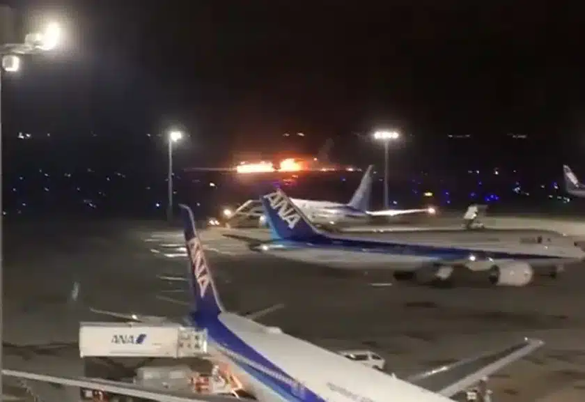 Όπως μεταδίδει το BBC, πλάνα που από το τηλεοπτικό δίκτυο NHK έδειξαν φλόγες να βγαίνουν από τα παράθυρα του αεροσκάφους και κάτω από αυτό. Ο διάδρομος επίσης πυρπολήθηκε.