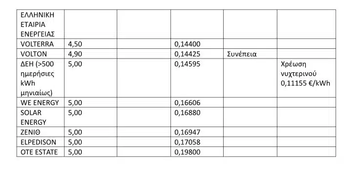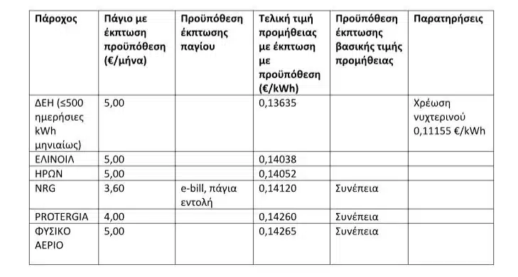 Ο ανταγωνισμός λειτούργησε στο ειδικό, πράσινο τιμολόγιο, με την πλειονότητα των παρόχων να προσφέρει τιμές κάτω των 0,15 ευρώ/kWh και ελάχιστους να κινούνται σε υψηλότερα επίπεδα. Το φθηνότερο πράσινο τιμολόγιο (για καταναλώσεις κάτω των 500 kWh) ανακοινώθηκε από την ΔΕΗ, με την τιμή χρέωσης να διαμορφώνεται σε 0,136 ευρώ/kWh, ακολούθησαν: ΕΛΙΝΟΙΛ με 0,14038 ευρώ/kWh, ΗΡΩΝ με 0,14052 ευρώ/kWh, NRG με 0,14120 ευρώ/kWh, PROTERGIA με 0,14260 ευρώ/kWh κ.λπ., ενώ στην τριάδα των ακριβότερων πράσινων τιμολογίων συμπεριλαμβάνονται οι: ΟΤΕ ESTATE (0,198 ευρώ/kWh), ELPEDISON (0,17058 ευρώ/kWh) και ΖΕΝΙΘ (0,16947 ευρώ/kWh).