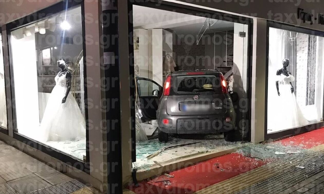 Βόλος: Τρέλη πορεία αυτοκινήτου – «Καβάλησε» το πεζοδρόμιο και κατέληξε σε βιτρίνα με νυφικά