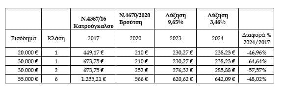 Ακολουθεί συγκριτικός Πίνακας με ενδεικτικά παραδείγματα για το ύψος των εισφορών μη μισθωτών, όπως διαμορφώθηκαν επί ΣΥΡΙΖΑ με το νόμο Κατρούγκαλου σε σύγκριση με το νόμο Βρούτση το 2020 και το τρέχον έτος 2024.
