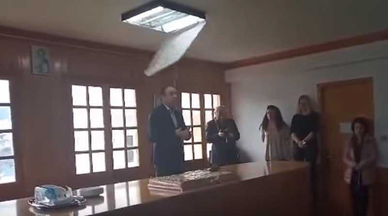 Μέχρι την στιγμή που το φωτιστικό «φεύγει» από το ταβάνι και καταλήγει αρχικά στο κεφάλι του δημάρχου και εν συνεχεία στο πάτωμα!