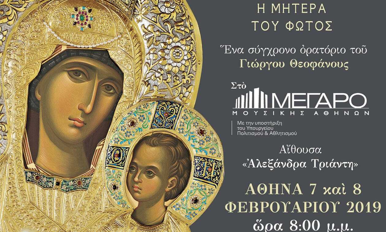 Το ορατόριο ΠΑΝΑΓΙΑ-Η ΜΗΤΕΡΑ ΤΟΥ ΦΩΤΟΣ θα παρουσιαστεί σε δύο παραστάσεις στην αίθουσα «Αλεξάνδρα Τριάντη» του Μεγάρου Μουσικής Αθηνών στις 7 και 8 Φεβρουαρίου 2019. Ωρα έναρξης 8 μμ.
