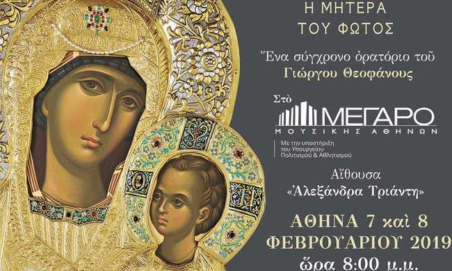Το ορατόριο ΠΑΝΑΓΙΑ-Η ΜΗΤΕΡΑ ΤΟΥ ΦΩΤΟΣ θα παρουσιαστεί σε δύο παραστάσεις στην αίθουσα «Αλεξάνδρα Τριάντη» του Μεγάρου Μουσικής Αθηνών στις 7 και 8 Φεβρουαρίου 2019. Ωρα έναρξης 8 μμ.