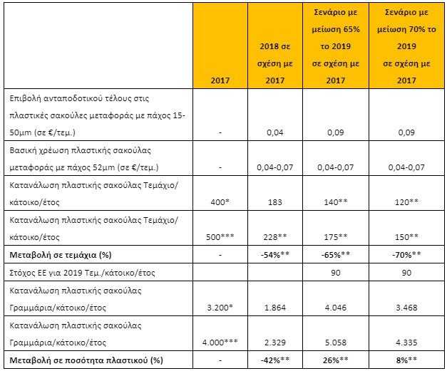 Αναλυτικός πίνακας με εκτιμήσεις εφαρμογής των μέτρων για τη μείωση της πλαστικής σακούλας τα έτη 2017 – 2019
