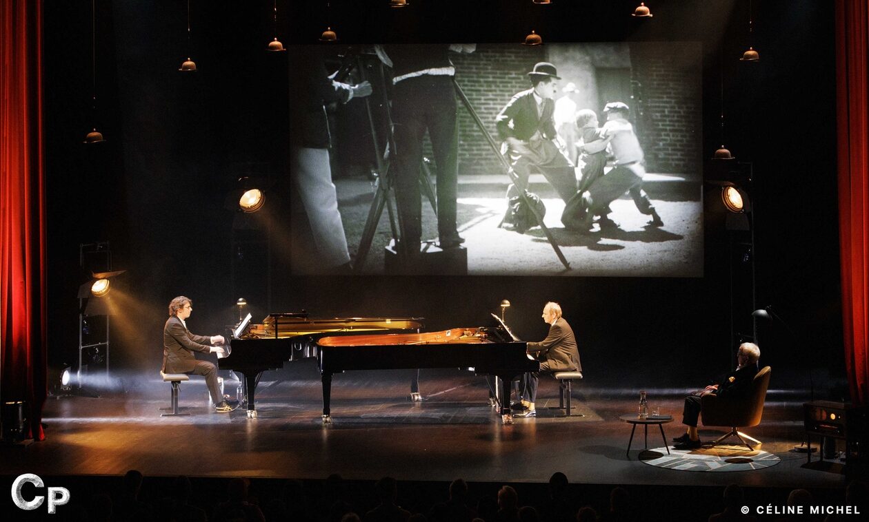 Μέσα από την προβολή εικόνων της καριέρας και της ζωής του, και υπό τον ήχο των δύο πιάνων, οι θεατές ταξιδεύουν στην ατμόσφαιρα της εποχής των διαχρονικών αριστουργημάτων της έβδομης τέχνης για να βιώσουν την εξίσου σπάνια μουσική ιδιοφυΐα του Τσάρλι Τσάπλιν.