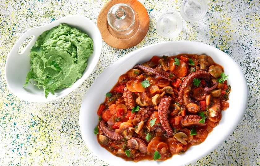 Σερβίρουμε το φαγητό με ένα λευκό πιλάφι ή, αν θέλουμε, με φάβα από ξερά μπιζέλια που φτιάχνουμε ως εξής: