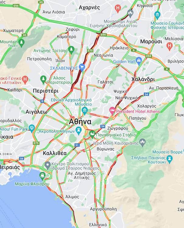 Κίνηση τώρα: Στο κόκκινο είναι ο Κηφισός και η Νέα Εθνική Οδός Αθηνών-Λαμίας με την τροχαία να πραγματοποιεί ελέγχους από το ύψος της εξόδου των Θρακομακεδώνων.