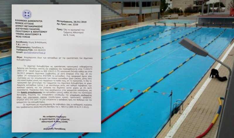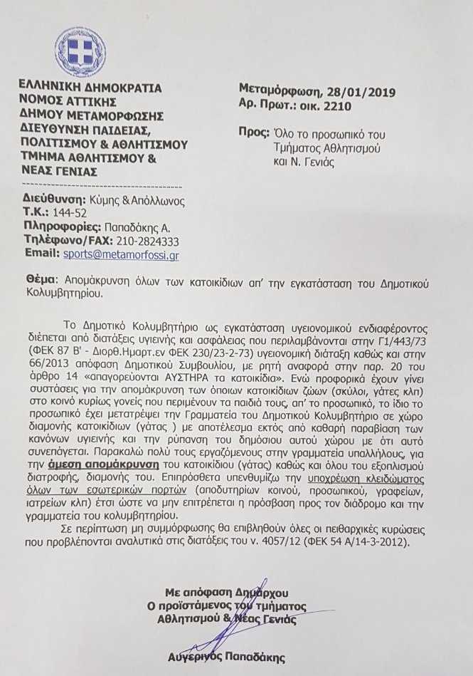 Ζητά από το προσωπικό μα μην ταΐζει και να μην περιθάλπει κανένα αδέσποτο. Από τη μανία και το μίσος που έχει για τα ζώα δεν ξέφυγε και η μασκότ του κολυμβητηρίου μια γατούλα η οποία είναι στειρωμένη και εμβολιασμένη και χαίρει ας περιποίησης χαδιών και παιχνιδιών τόσο από το προσωπικό αλλά και από όλους εμάς τους αθλούμενους μικρούς και μεγάλους.