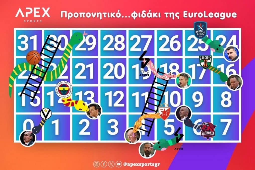 24 αγωνιστικές, 8 αλλαγές προπονητών σε 7 από τις 18 ομάδες της διοργάνωσης. Αν ήταν παιδικό παιχνίδι η φετινή διοργάνωση θα ήταν… φιδάκι. Το θυμάστε (ειδικά οι boomer) το επιτραπέζιο παιχνίδι που παίζαμε μικροί, το φιδάκι; Ένα τέτοιο “ταμπλό” έχει ανοίξει φέτος στη διοργάνωσης της Ευρωλίγκα και τα… φιδάκια τρώνε τον έναν μετά τον άλλο …