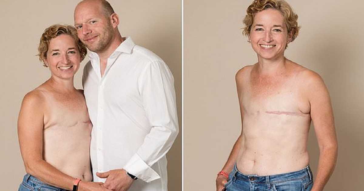 Μια γενναία μητέρα των τριών παιδιών ποζάρει τόπλες για να δείξει τις ουλές της διπλής μαστεκτομής της, μετά την τριπλή νίκη της με τον καρκίνο του μαστού.