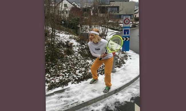 Φορώντας αθλητικά και με μία ρακέτα στο χέρι η Μαρία στήθηκε στο χιονισμένο πεζοδρόμιο περιμένοντας τον αντίπαλο… αν φυσικά εκείνος υπήρχε… Πάντως, ο αγαπημένος της γνωρίζει να παίζει τέννις… Λέτε να έστησαν αγώνα στο πεζοδρόμιο;